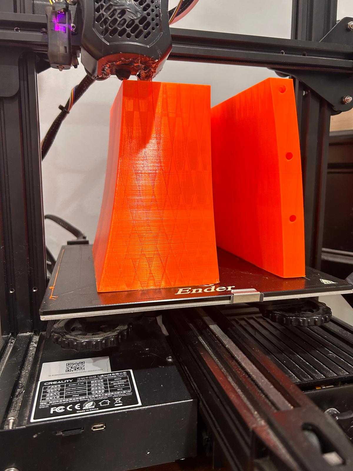 To 3D print this design, the components were initially segmented and printed in batches due to limitations imposed by the available print bed size. The segmented parts were joined using dowels and adhesive bonding, which was selected as a simple and lightweight assembly method. However, this approach did not sufficiently account for dimensional inaccuracies inherent to FDM printing, resulting in accumulated alignment errors and a slightly misaligned final assembly.